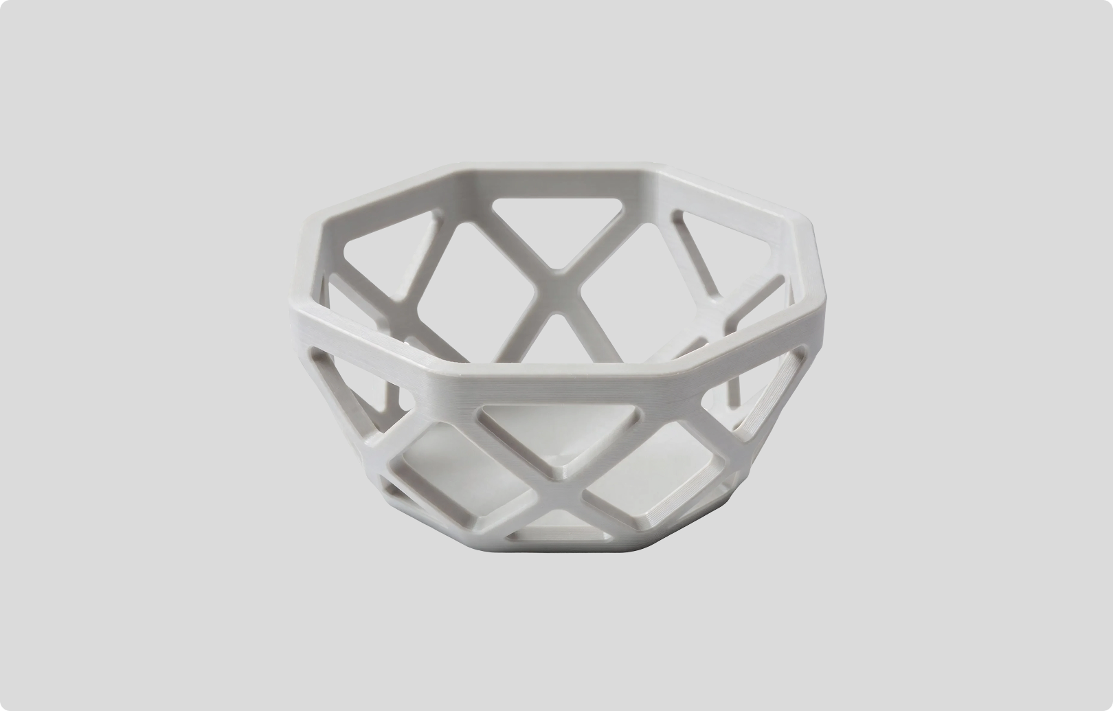 A lightweight bowl featuring a geometric design that encourages airflow around fruit. Works as both a storage solution and a table centerpiece.